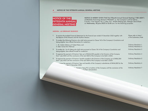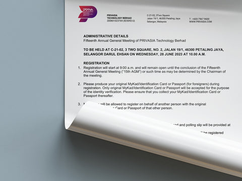 In our effort to reduce paper consumption, the following documents listed below are available here for you to download. Clicking on the links or the images will give you access to the respective PRIVASIA documents, pertaining to the 15th AGM of PRIVASIA.